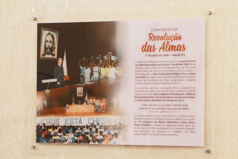 A homenagem relembra o histórico Congresso da Revolução das Almas, realizado em 1º de abril de 1988, no Centro de Convenções de Pernambuco, quando o Irmão Paiva Netto conduziu um encontro que ficou eternizado na história espiritual da região. Na ocasião, o Ideal da Boa Vontade de Deus foi reafirmado no coração dos Cristãos e Cristãs do Novo Mandamento, Amigos de Jesus: “Amai-vos como Eu vos amei. Somente assim podereis ser reconhecidos como meus discípulos” (Evangelho, segundo João, 13:34 e 35).