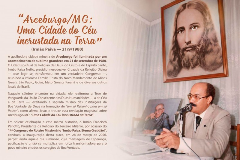 A homenagem da placa comemorativa relembra e eterniza a visita do líder espiritual da Religião de Deus, Irmão José de Paiva Netto, a Arceburgo, em 21 de setembro de 1980, onde presidiu inesquecível Cruzada da Religião Divina — que logo se transformou em um verdadeiro Congresso —, reunindo a valorosa Família Cristã do Novo Mandamento de Minas Gerais, São Paulo, Goiás, Mato Grosso, Paraná e de diversos outros locais do Brasil.