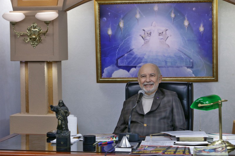 O presidente-pregador da Religião do Terceiro Milênio, José de Paiva Netto, discursa na sessão solene de conclusão do 42º Fórum Internacional do Jovem Ecumênico da Boa Vontade de Deus. O pronunciamento é transmitido para o mundo inteiro, via satélite, pela Super Rede Boa Vontade de Comunicação (TV, rádio e internet).