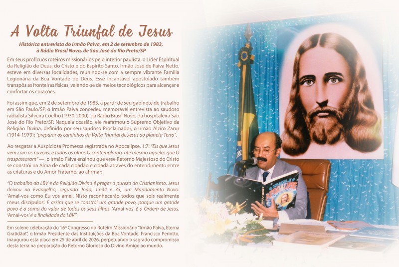 Na ocasião, todos puderam ouvir o áudio dessa conversa com o radialista e jornalista Silveira Coelho (1930-200), do programa O Fantástico Show da Viola — momento em que o Irmão Paiva falou sobre a Volta Triunfal de Jesus e a divina missão do trabalho da Legião da Boa Vontade e da Religião Divina de “pregar a pureza do Cristianismo”, a partir do Novo Mandamento do Divino Mestre.